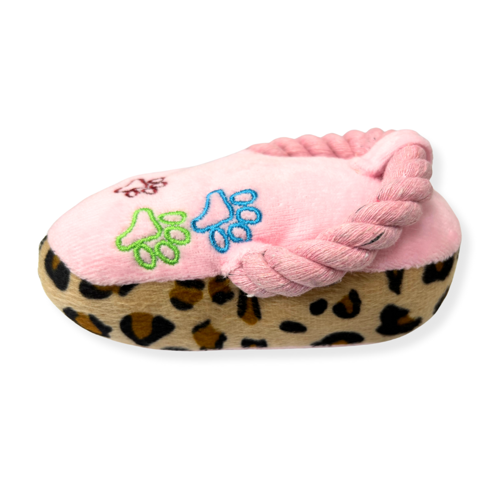 Diversión con estilo para tu mascota. Este juguete con forma de sandalia combina suavidad, colores vibrantes y un diseño único tipo animal print. Es ideal para que tu perro o gato juegue, muerda o simplemente lo abrace durante sus siestas.