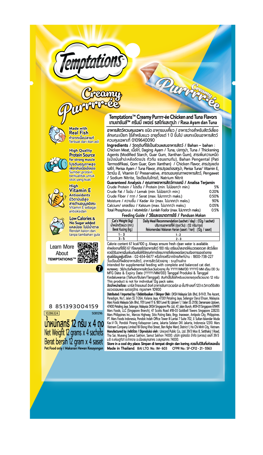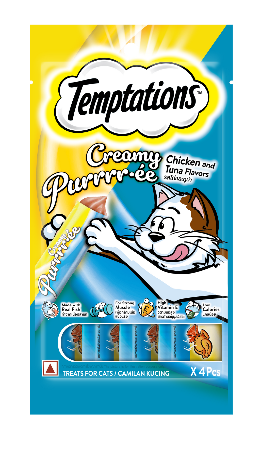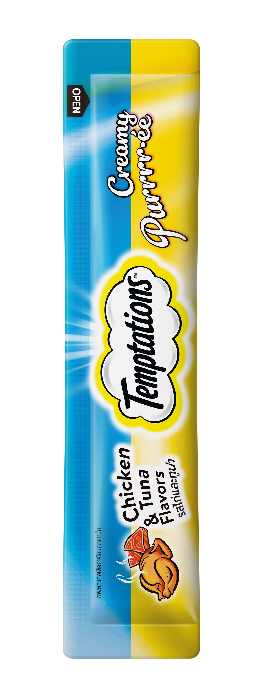 Consiente a tu gato con este exquisito tubo de puré cremoso con sabores de pollo y atún: hecho con carne de pollo real, atún, agentes espesantes (almidón modificado, goma guar, goma xantana), saborizantes de pollo y de atún, vitamina E y conservante (nitrito de sodio) como ingredientes claves.