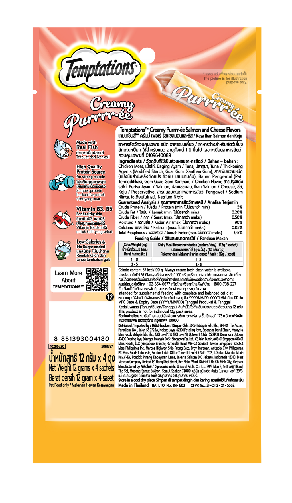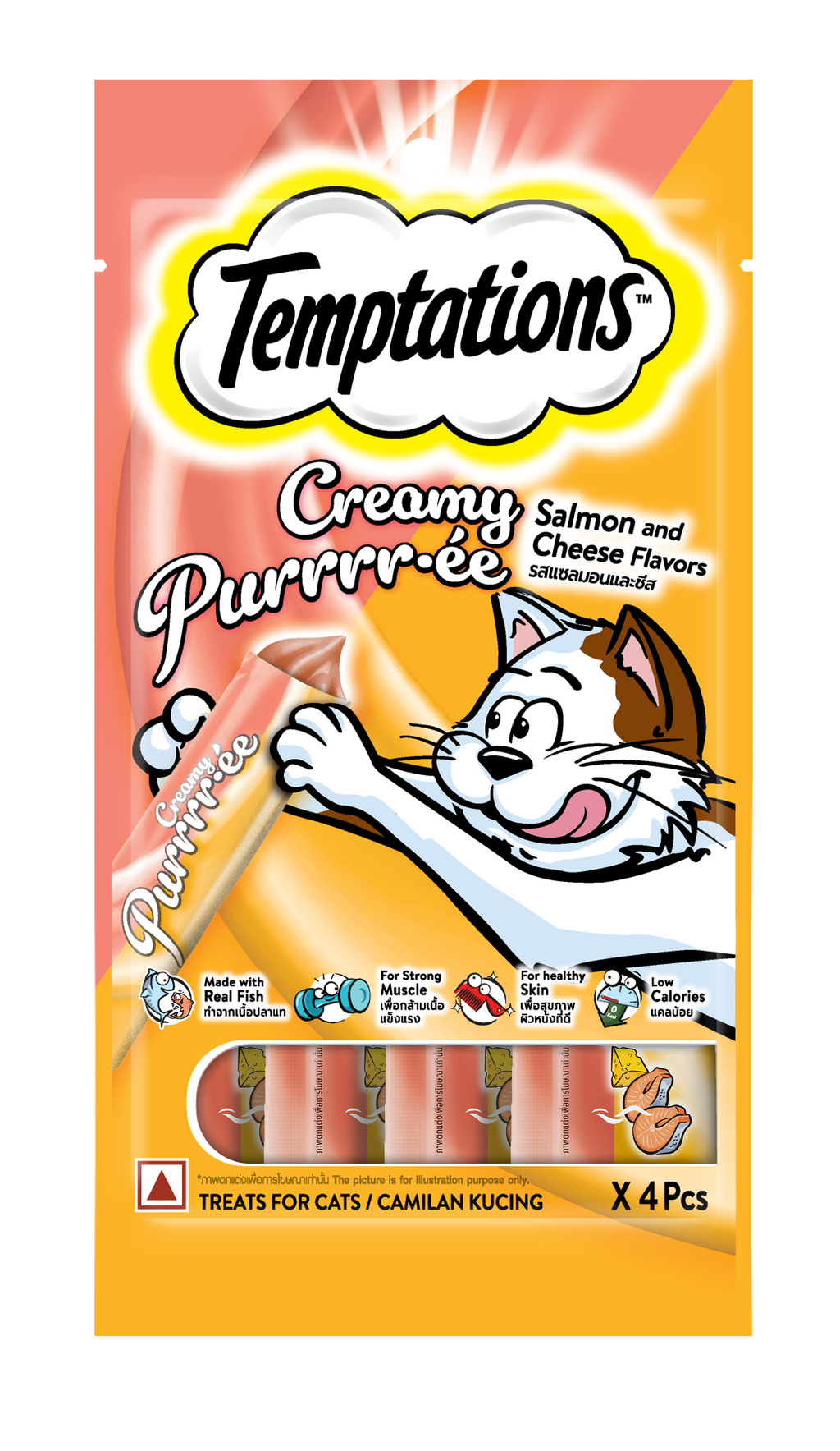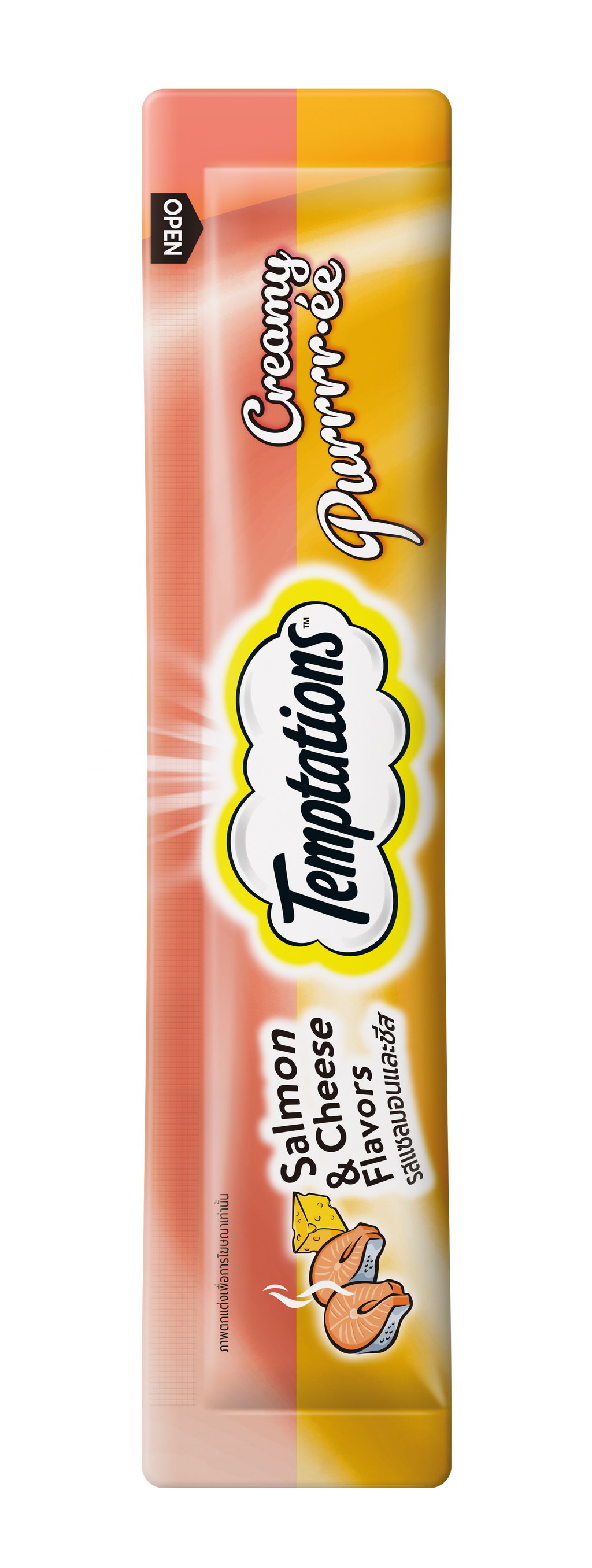 Haz felíz a tu gato con Temptations Creamy Purrrr-ee Salmon & Cheese: una exquisita golosina tipo puré con sabores naturales de salmón y queso, elaborada con carne de pollo y atún, espesantes como almidón modificado, goma guar y goma xantana, aromatizantes de pollo y atún, enriquecida con vitamina E, conservada con nitrito de sodio.